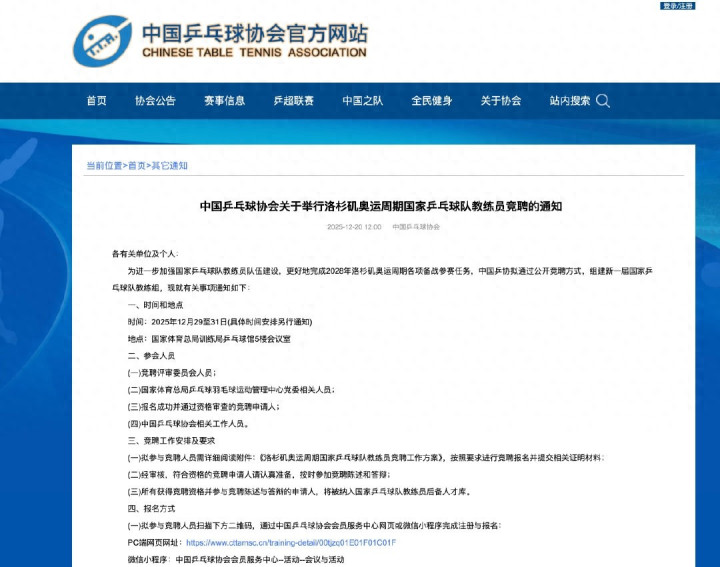 12月20日国乒进行教悔员的竞聘报名,截止到12月26日达成。12月29日到31日这三天时辰进行教悔员的竞聘。此次竞聘将进行公开答辩,无记名投票的形势进行。况兼此次教悔团队除了有总教悔以外,还要增设副总教悔又名。同期选出男女队的主教悔以及后生队的主教悔各1东谈主,此次后生队的教悔员增至十东谈主,成年队的教悔员是12东谈主。