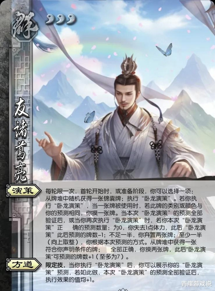 第二位烂将必是友系列的诸葛亮,强度不必置疑,最强摸牌武将。仅仅这个【演策】确切过于无脑,平直碾压了老牌神郭嘉的地位。不愧是算无遗筞的孔明大东说念主,操作性平直拉满……玩家们对他的嘲讽是这么的:我又猜到我方思出牌啦,我确凿太锐利了!